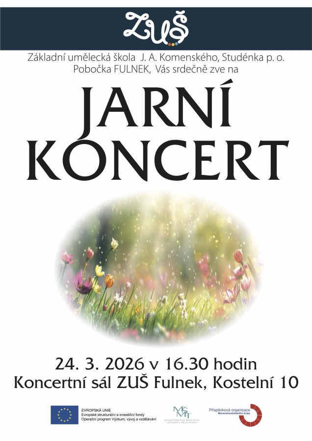 Pobočka ZUŠ ve Fulneku vás zve na jarní koncert, který se uskuteční 24. března 2026 v 16:30 v koncertním sále ZUŠ Fulnek na ulici Kostelní.