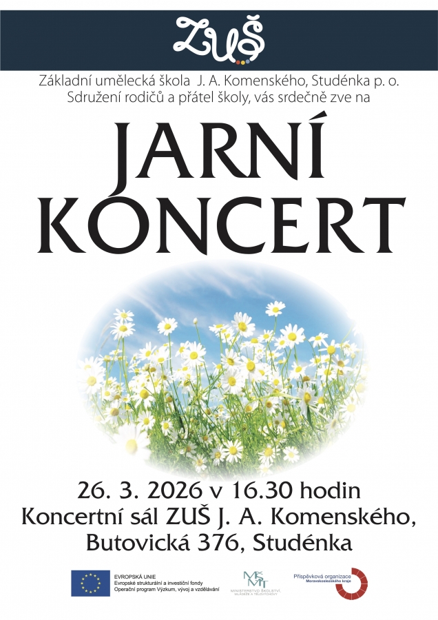 Zveme vás na jarní koncert žáků ZUŠ Studénka, který se uskuteční 26. března 2026 v 16:30 v koncertním sále ZUŠ J. A. Komenského na ulici Butovická ve Studénce.