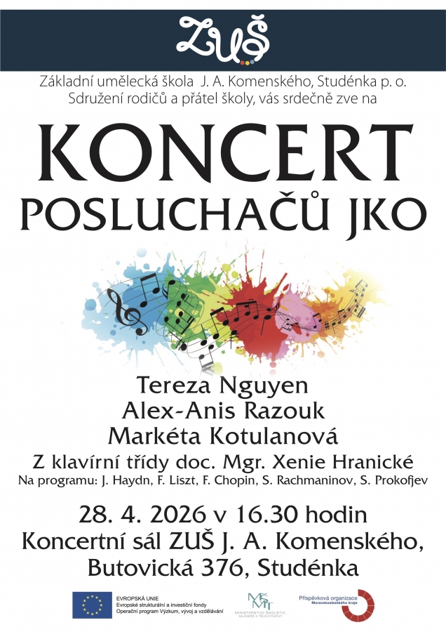 Základní umělecká škola J. A. Komenského ve Studénce ve spolupráci se Sdružením rodičů a přátel školy připravila Koncert posluchačů JKO. V rámci odpoledne se představí nadějní klavíristé Tereza Nguyen, Alex-Anis Razouk a Markéta Kotulanová. Všichni účinkující studují v klavírní třídě doc. Mgr. Xenie Hranické.