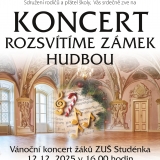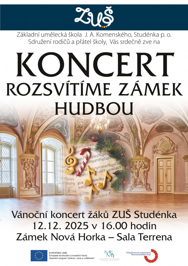 Přijměte naše pozvání na vánoční koncert žáků ZUŠ Studénka s názvem „Rozsvítíme zámek hudbou“, který se bude konat 12. prosince 2025 v 16:00 v zámku Nová Horka, v prostorách Sala Terrena.