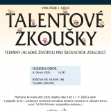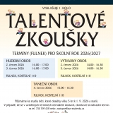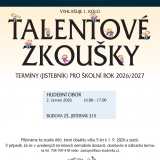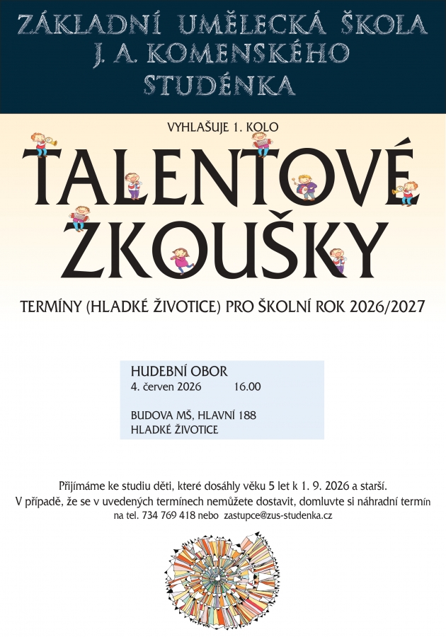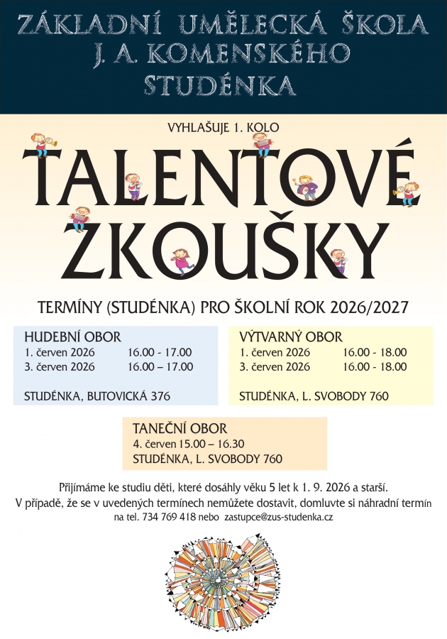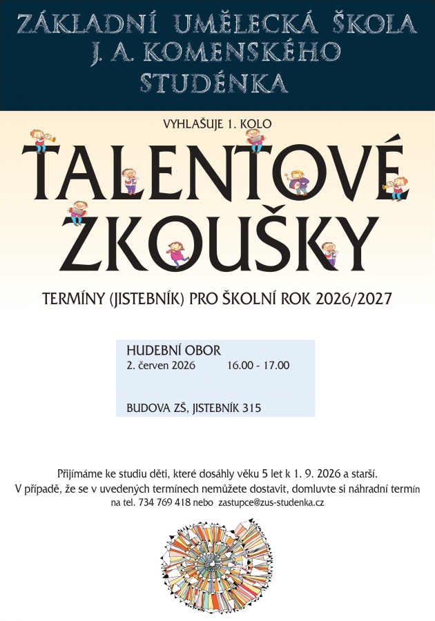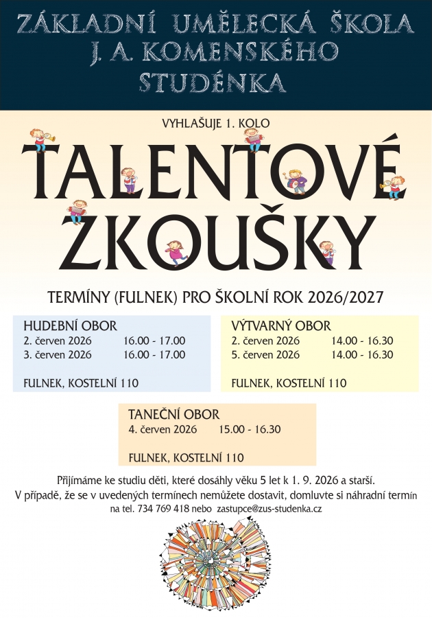 V týdnu 1. 6. – 5. 6. 2026 proběhne 1. kolo talentových zkoušek pro přijetí žáků na Základní uměleckou školu J. A. Komenského, Studénka.
