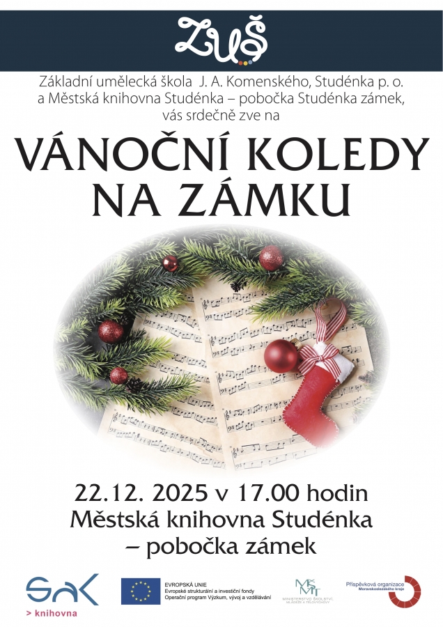 Zveme Vás na koncert s názvem Vánoční koledy na zámku, který se uskuteční 22. prosince 2025 v 17:00 hodin v Městské knihovně ve Studénce.