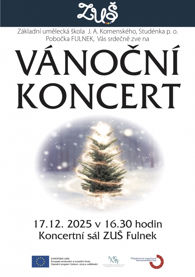 Pobočka ZUŠ ve Fulneku vás zve na vánoční koncert, který se uskuteční 17. prosince 2025 v 16:30 v koncertním sále ZUŠ Fulnek.