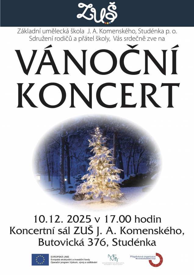 Srdečně Vás zveme na Vánoční koncert, který se uskuteční 10. prosince 2025 v 17:00 v koncertním sále ZUŠ na ulici Butovická ve Studénce.